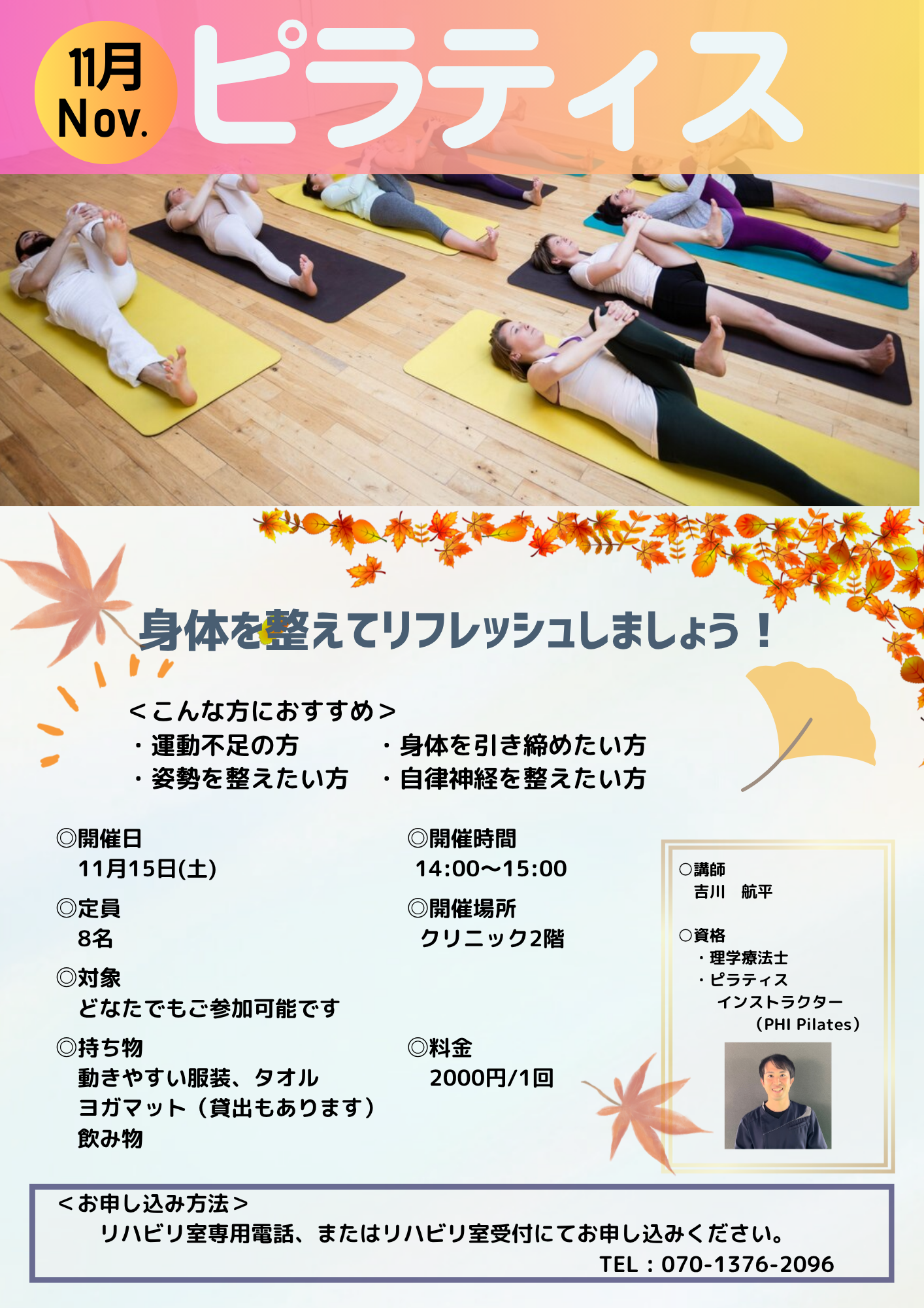 ピラティスは、インナーマッスルの強化、全身の筋力アップ、代謝の改善、姿勢の改善、肩こり・腰痛の改善・予防などに効果的です!