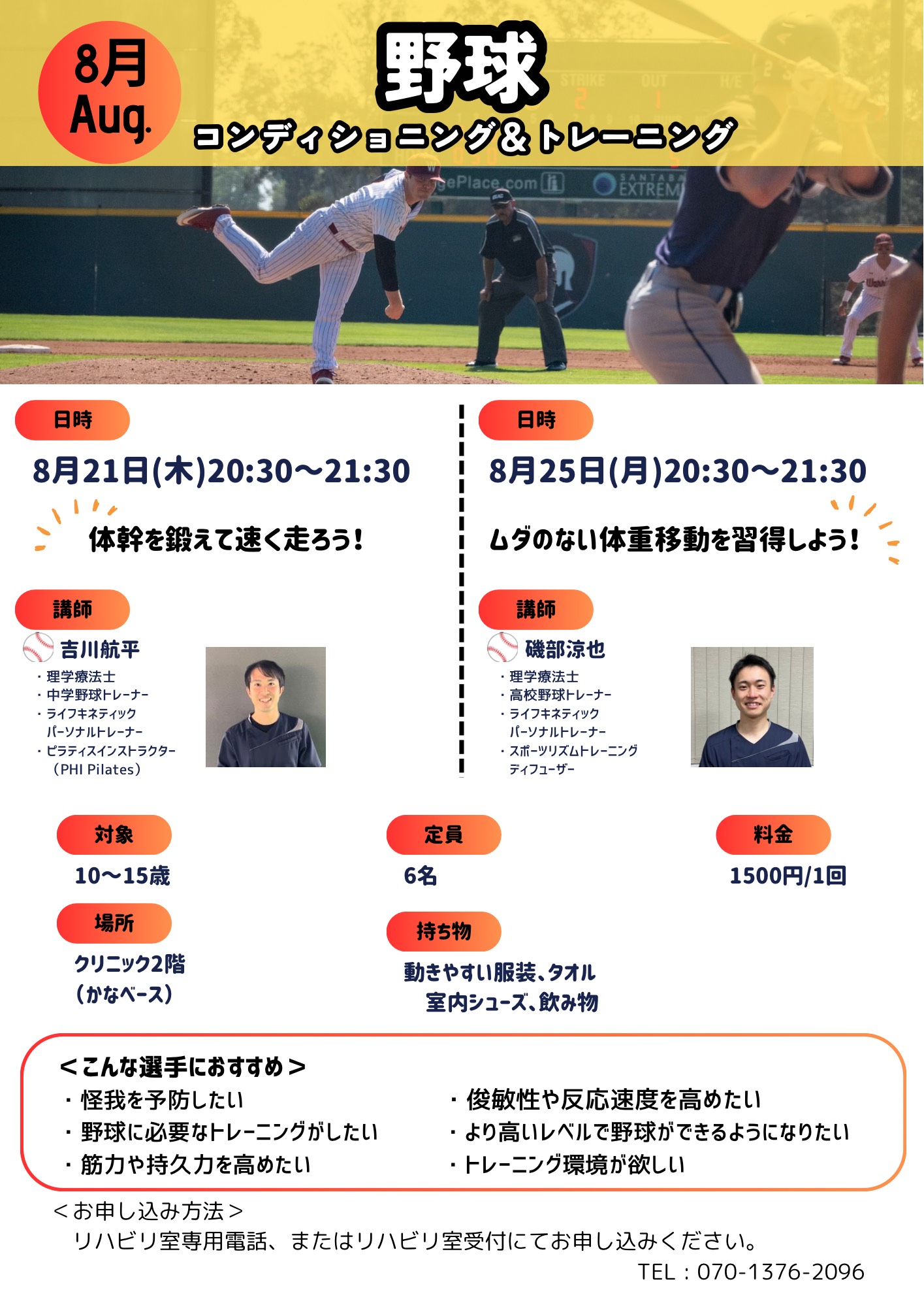 ③ 12月18日(木)、12月22日(木)理学療法士の磯部涼也、吉川航平による「野球 コンディショニング&トレーニング」を開催します。